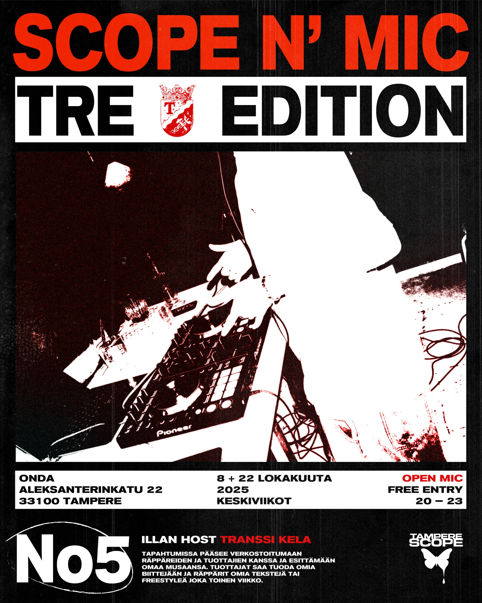 Are you craving a community in the music scene of Tampere? Scope n’ mic is exactly what you need! At these open mic events, you can network with other artists and producers and perform your own music. Beats, written lyrics or freestyle, you name it! Every genre is welcome!